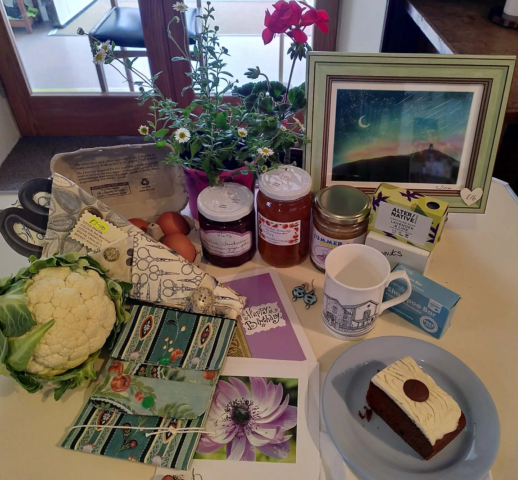 We have stalls of fresh vegetables, eggs, butter, meat, baked goods including some Gluten Free produce, pies, pasties, preserves, plants & flowers, beautiful cards, handmade gifts & pictures, bespoke bags, funky Jewellery, hand knitted items, Eco Friendly Products, upcycled items & Bric-a-brac stalls.