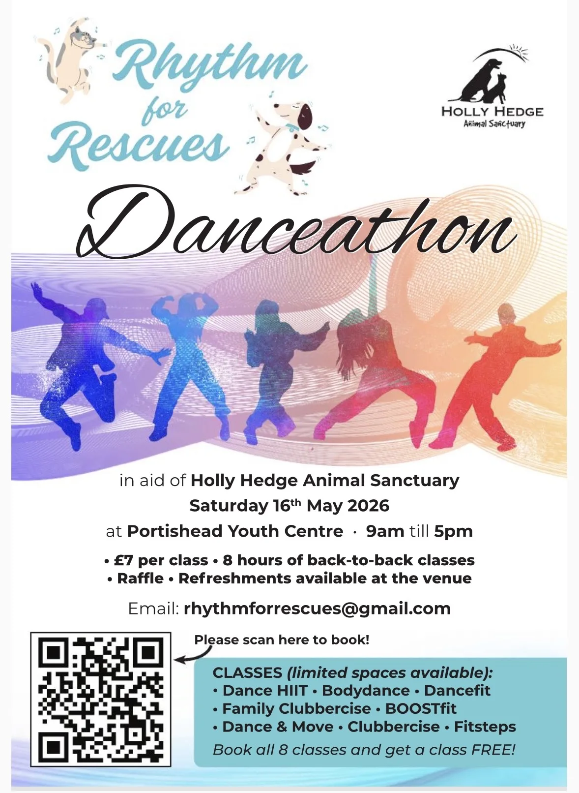 Why not join the Rhythm for Rescues Danceathon in aid of Holly Hedge Animal Sanctuary on Saturday 16th May at Portishead Youth & Community Centre